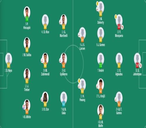 狼队首发:31-约翰斯通、2-多赫蒂(69'38-查丘瓦)、15-耶森-莫斯克拉、12-阿格巴杜、24-托迪、6-沃尔费、37-克雷伊奇(80'10-阿里亚斯)、7-特林达德、8-若昂-戈麦斯(86'36-马特乌斯-马内)、11-黄喜灿(80'28-费尔-洛佩斯)、9-拉尔森(69'14-阿洛科达尔)