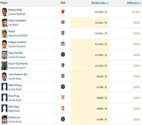 本期中超球员身价上涨幅度排名:
