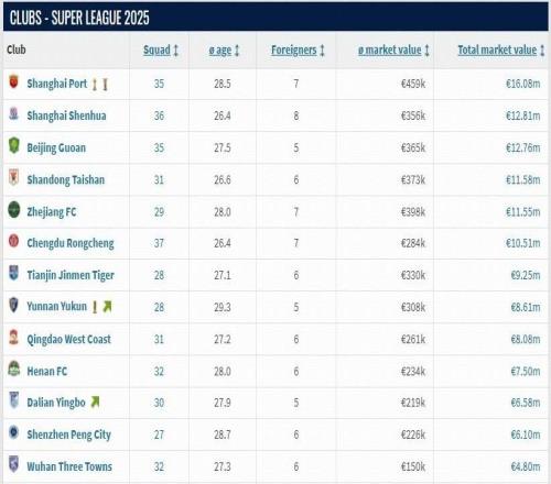 中超球队身价榜:海港居首,申花第二,国安第三,山东第四 -